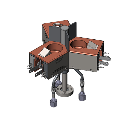 Hanks HM² Triad 10kW HM2 series three (3) pocket e-Gun™, 10cc, 15cc, and 40cc crucible. Minimum bottom mount flange size is 16.5″ O.D. Cf flange